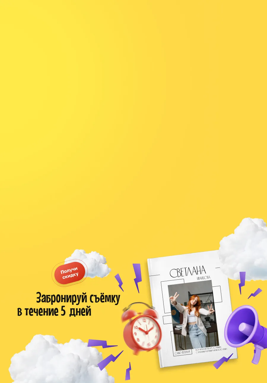 Успейте забронировать фотосъемку в течение 5 дней с момента первого обращения и получите дополнительную скидку до 10% на выпускной альбом!
