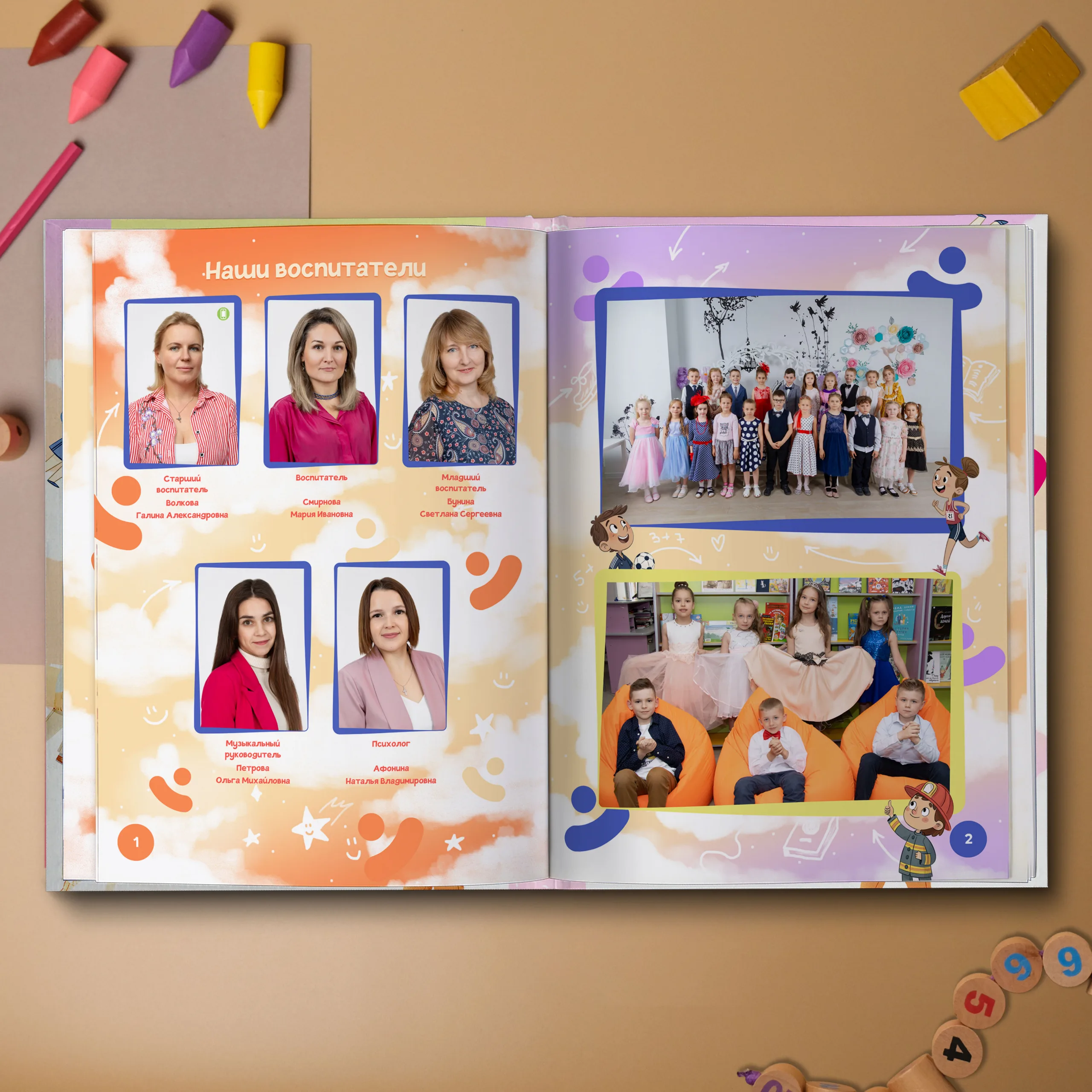 1ый разворот — виньетки педагогов и две общие фотографии