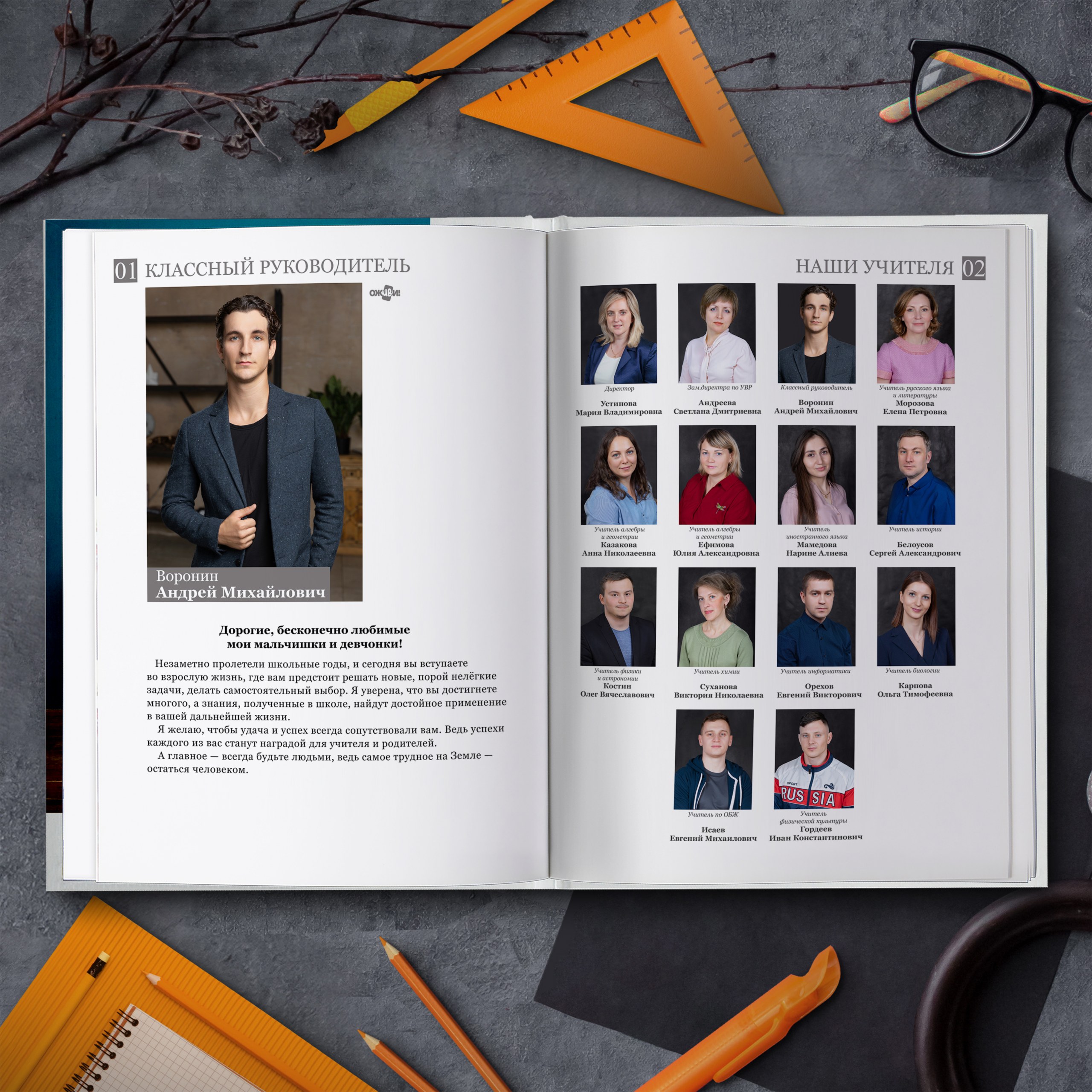 1ый разворот — виньетки педагогов и фотография классного руководителя с напутственным словом