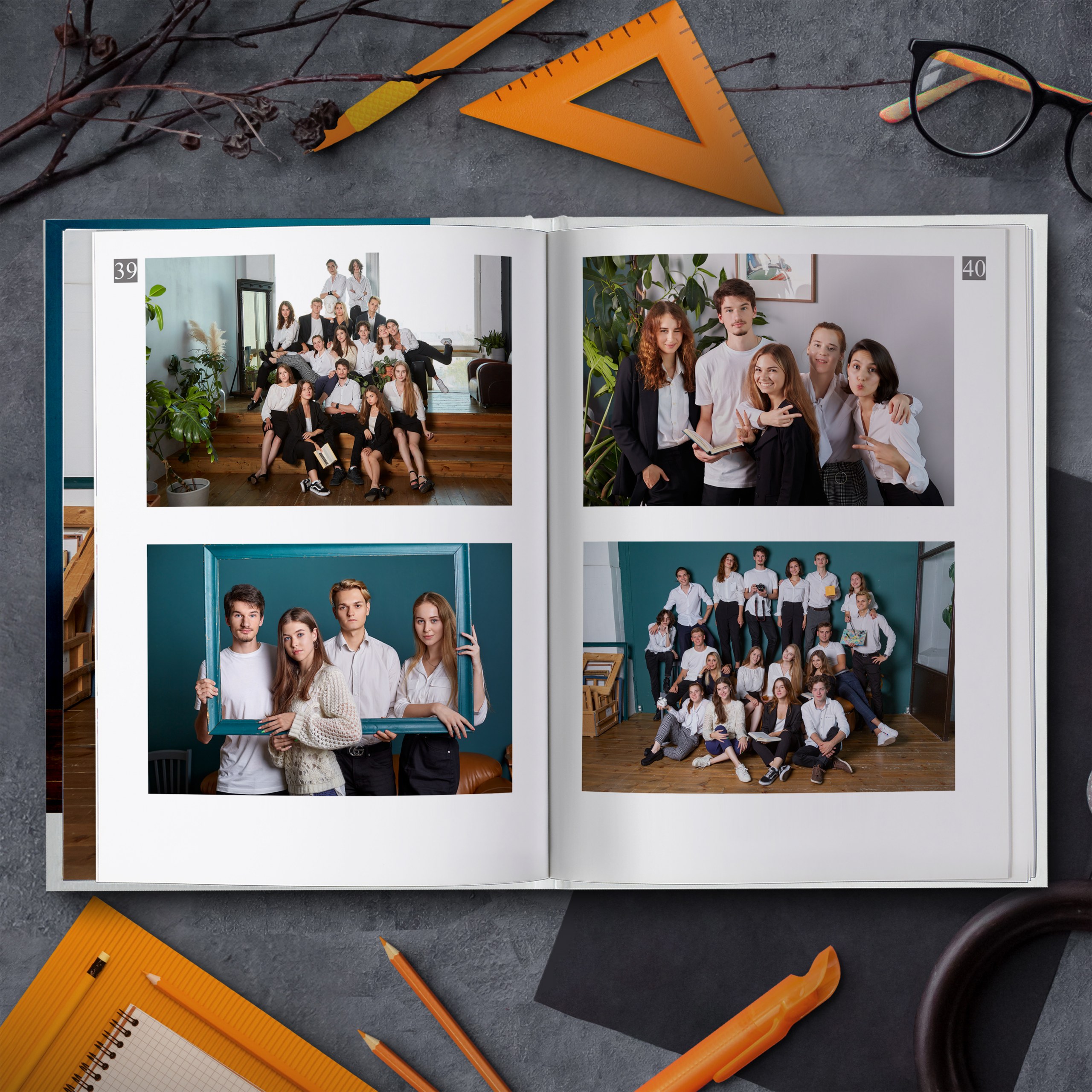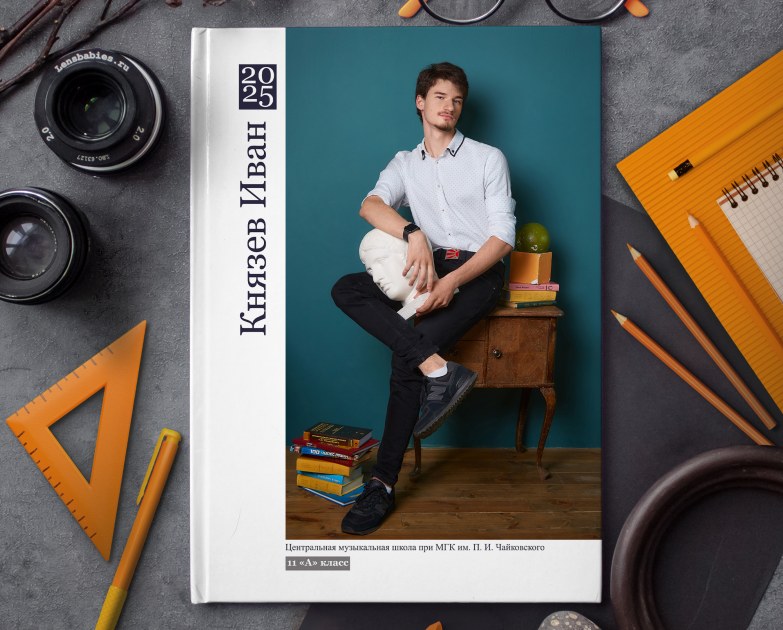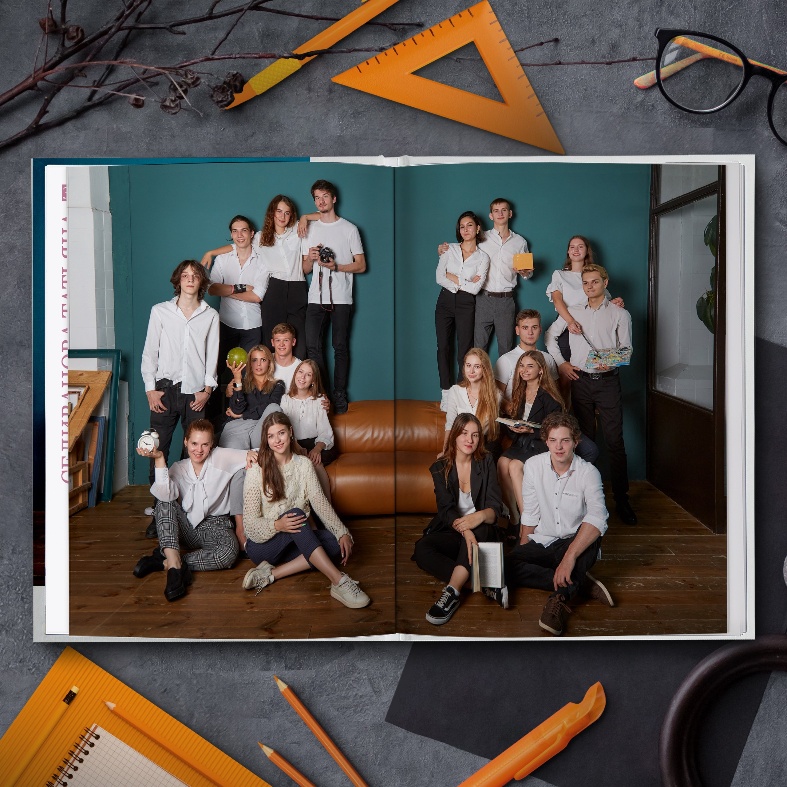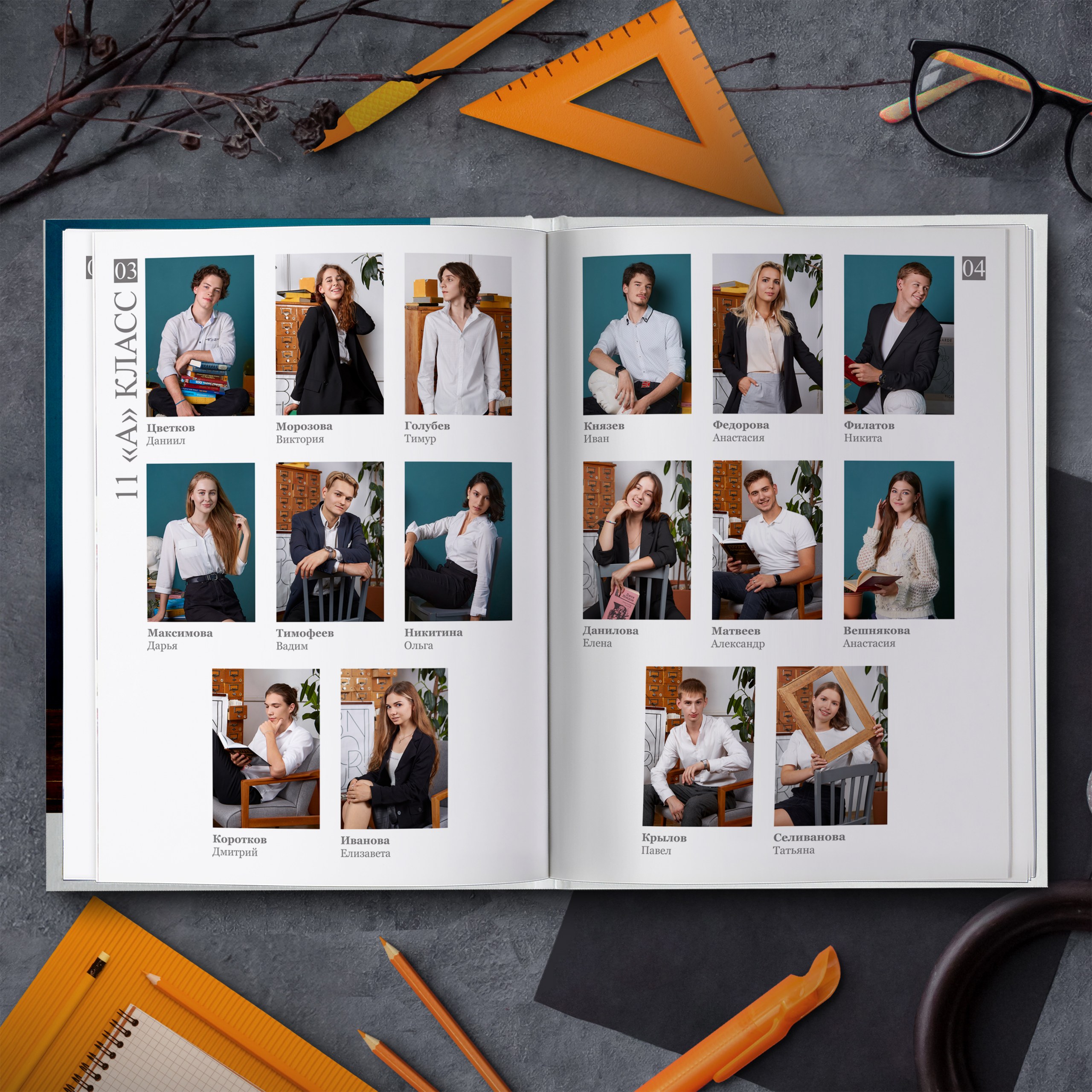Съемка проходит в интерьерной фотостудии с большим количеством различного тематического реквизита. И помимо полного разворота с общей фотографией, мы добавили личную страницу для каждого ученика с фотографией, снятой в лучших традициях интерьерной съемки.