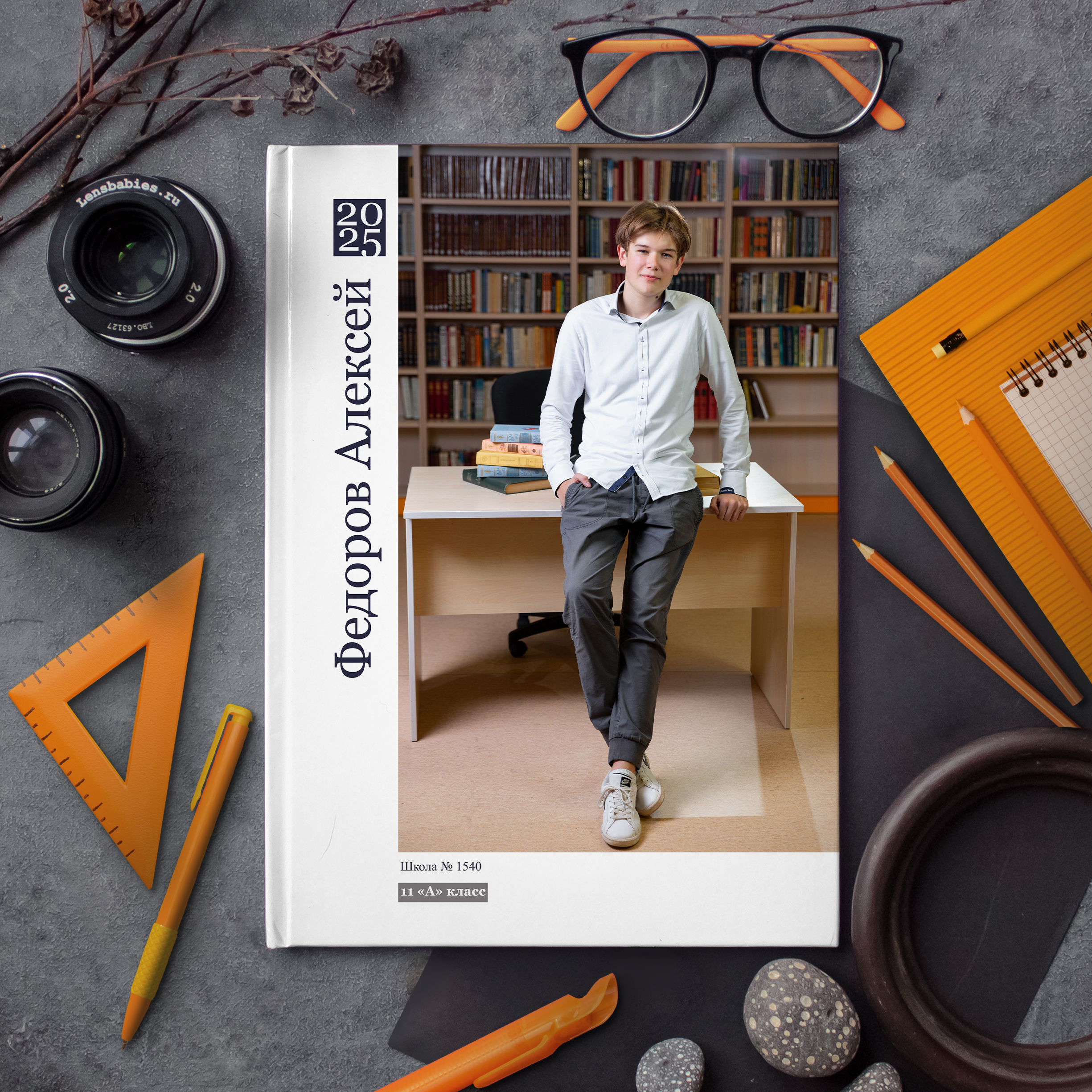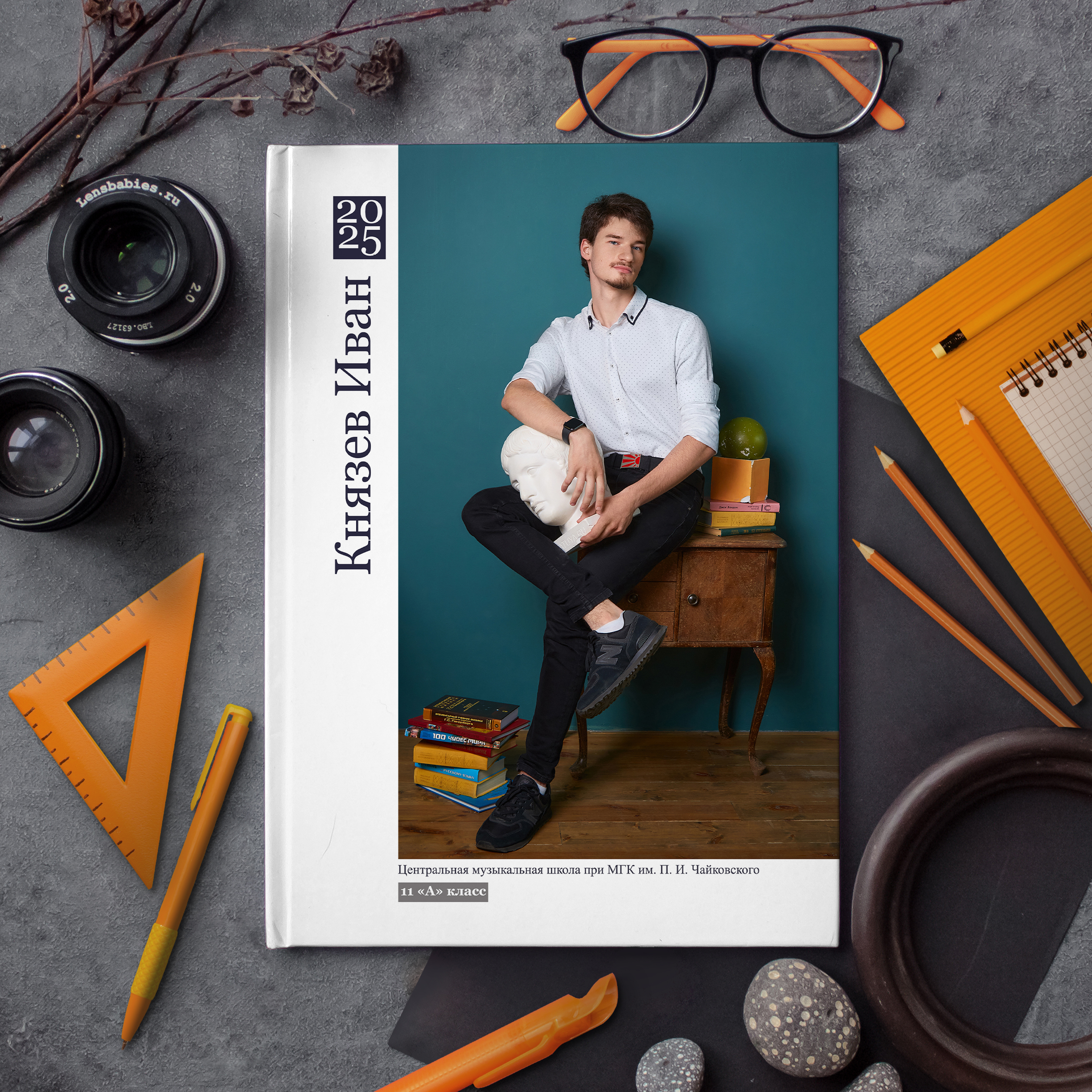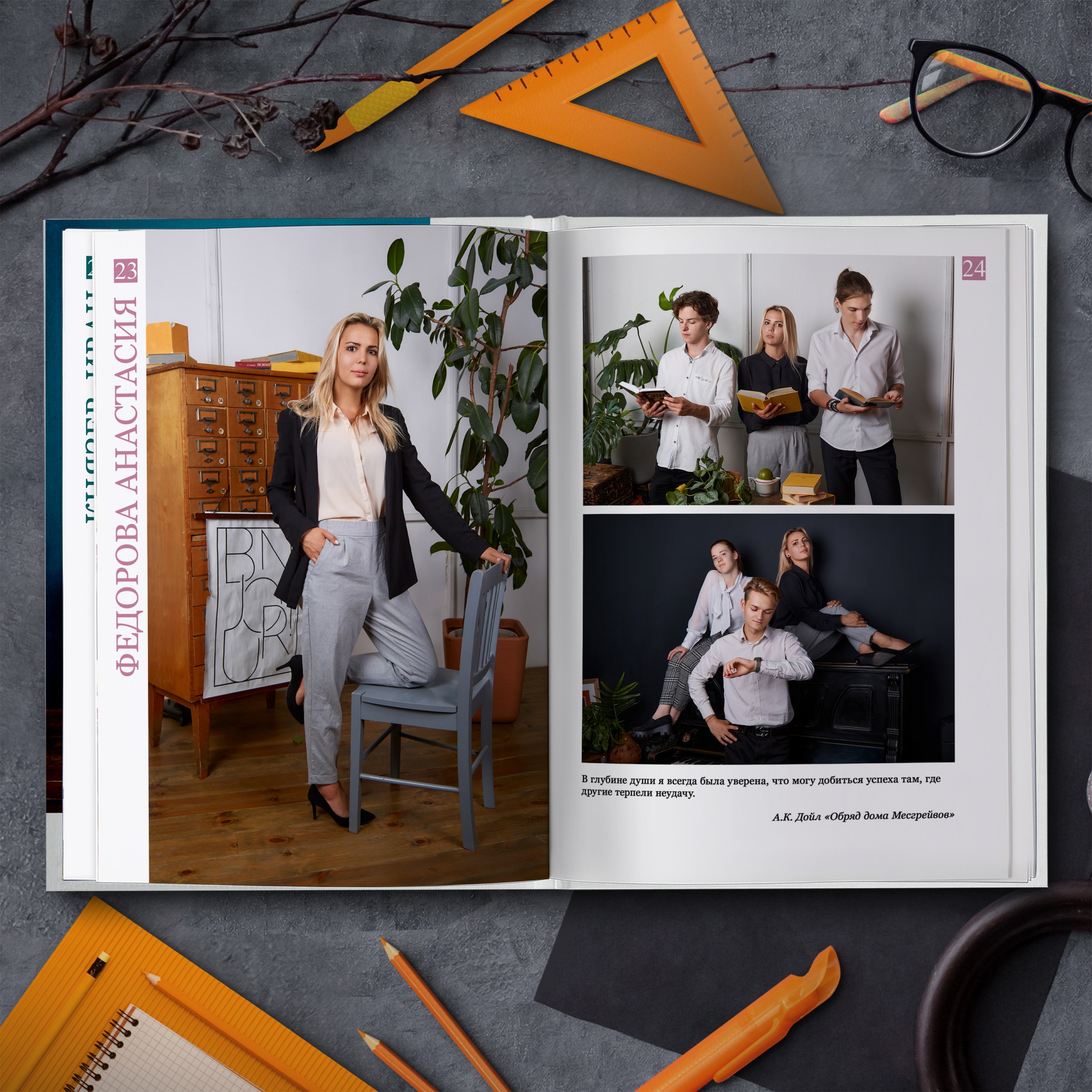Съемка проходит в интерьерной фотостудии с большим количеством различного тематического реквизита. И помимо полного разворота с общей фотографией, мы добавили личную страницу для каждого ученика с фотографией, снятой в лучших традициях интерьерной съемки.