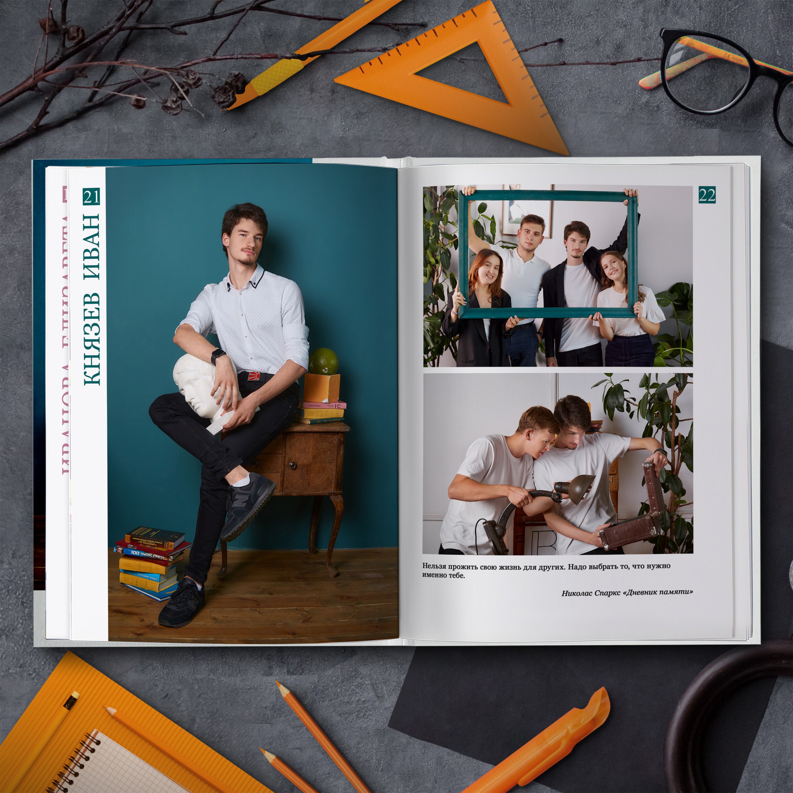 Съемка проходит в антураже школы. И помимо полного разворота с общей фотографией, мы добавили личную страницу для каждого ученика с фотографией, снятой в лучших традициях интерьерной съемки.