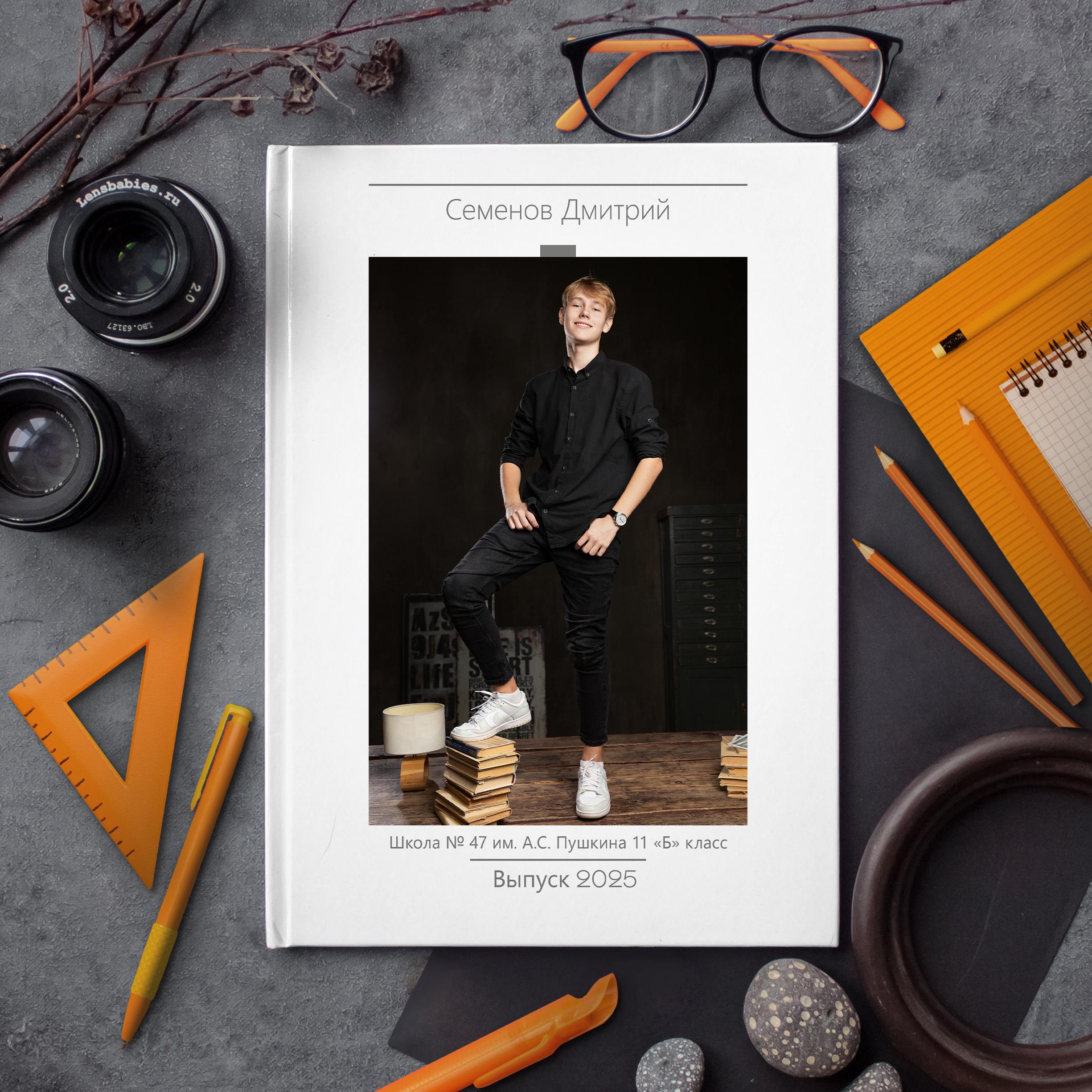 Вариант «Студийный» представлен с двумя студийными фотографиями выпускника в полный рост и три четверти на личном развороте.