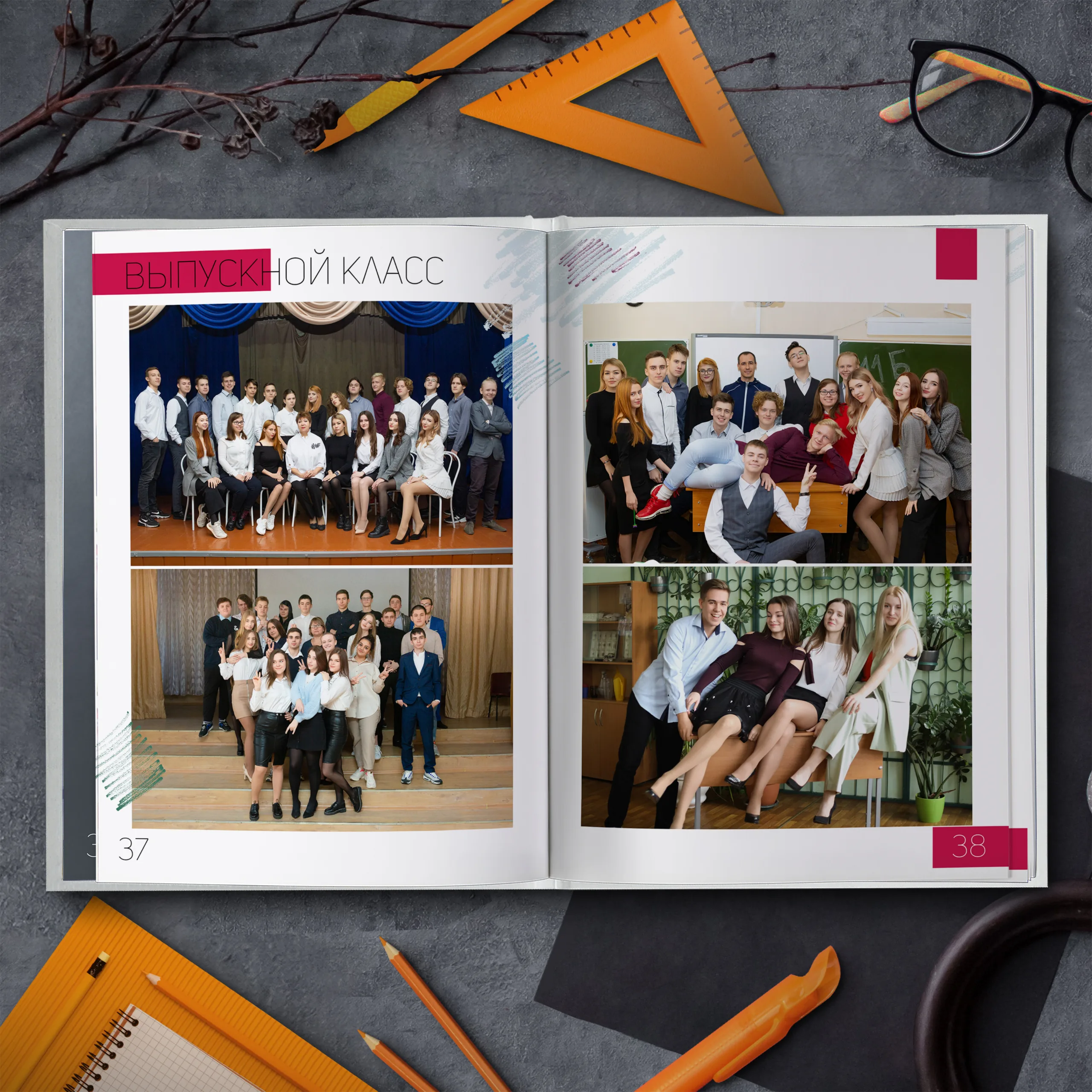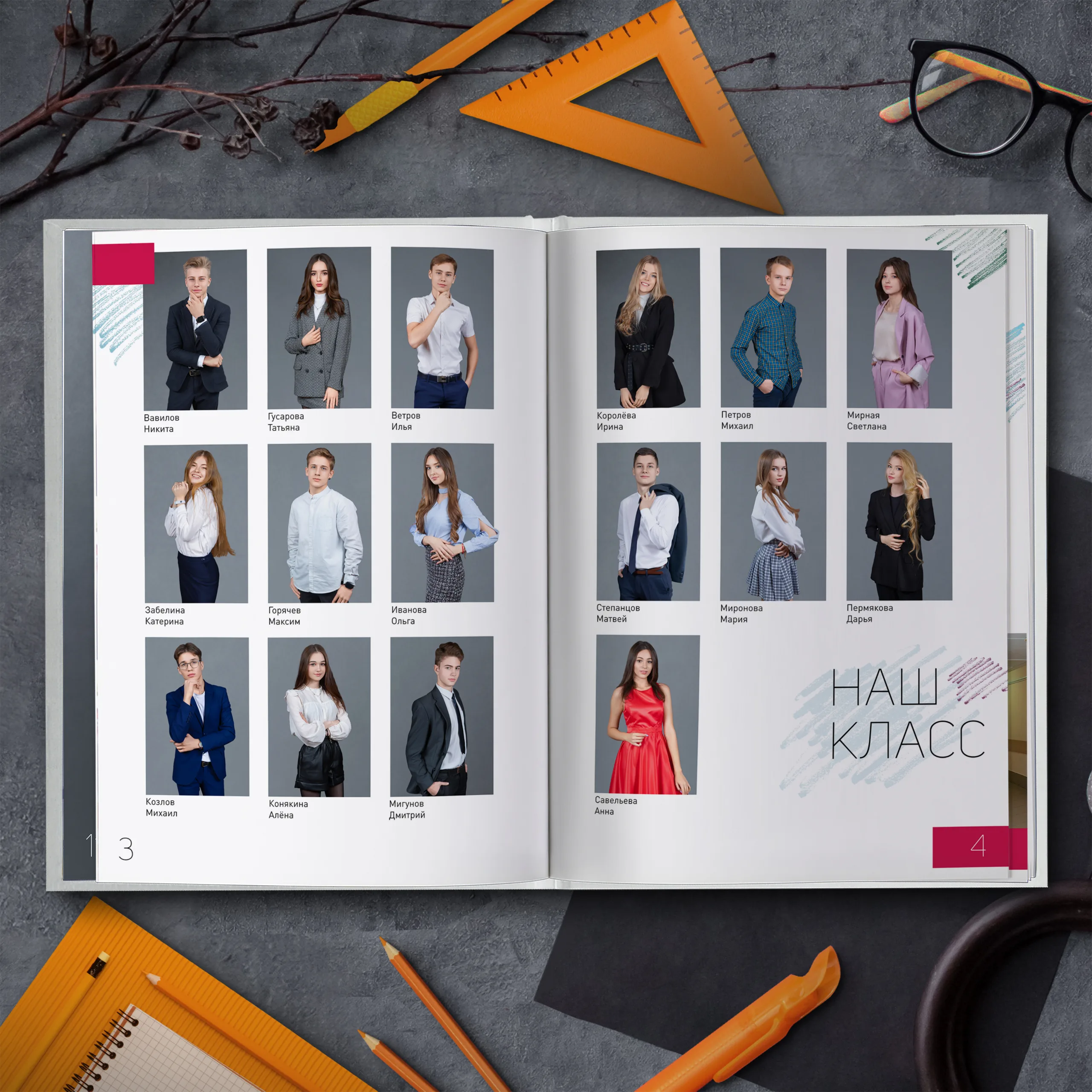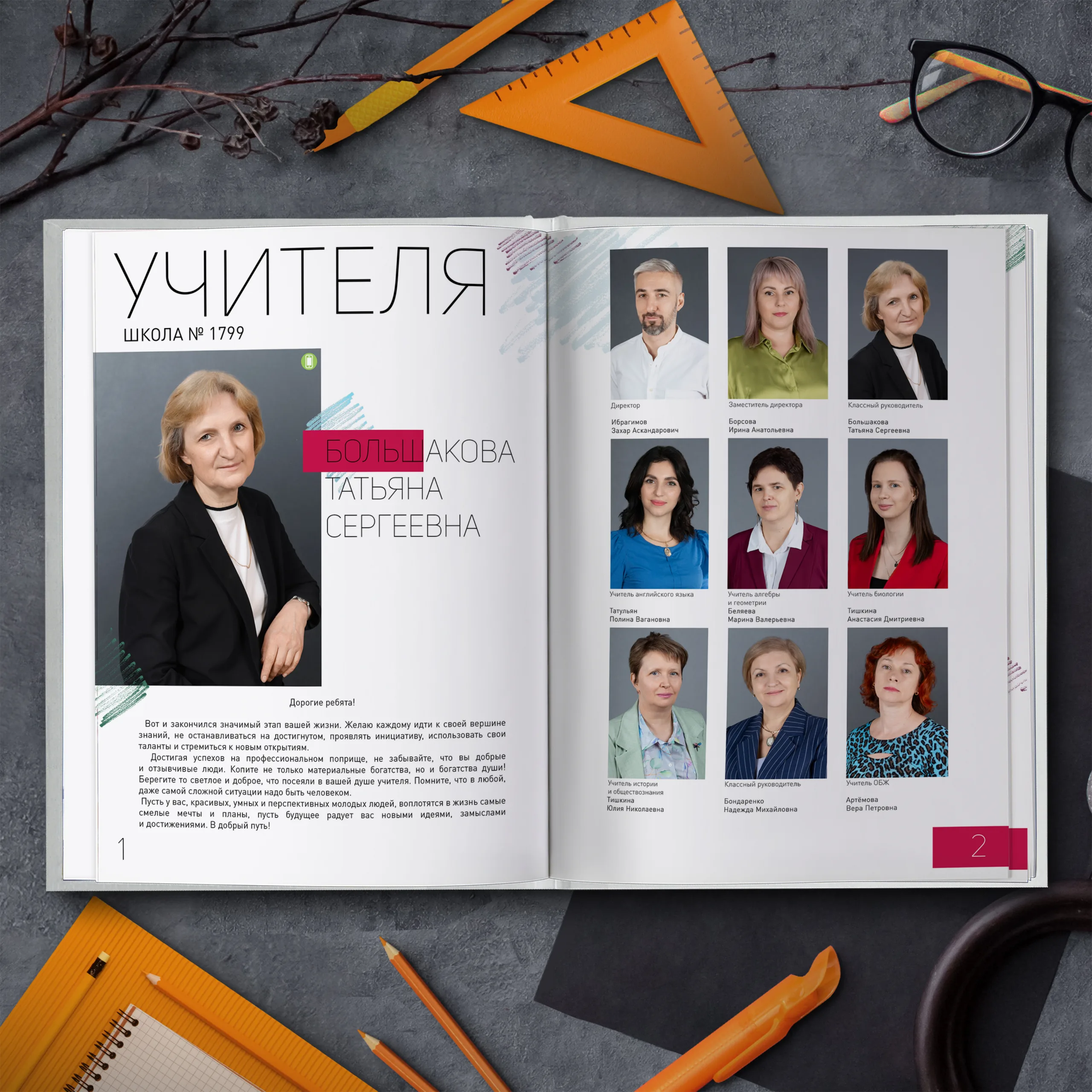 1ый разворот — фотография классного руководителя с напутственным словом и виньетки педагогов